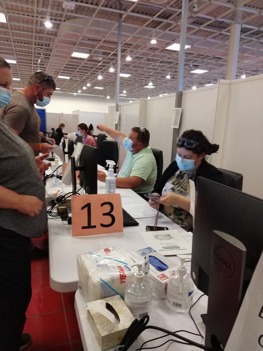 The queue is calm, orderly. But it’s hot & there’s not much shade. People all around the parking lot, in shade puddles, waiting for their time’s announcement. @ 13:17, she invites 13:00 (1pm) appointments.